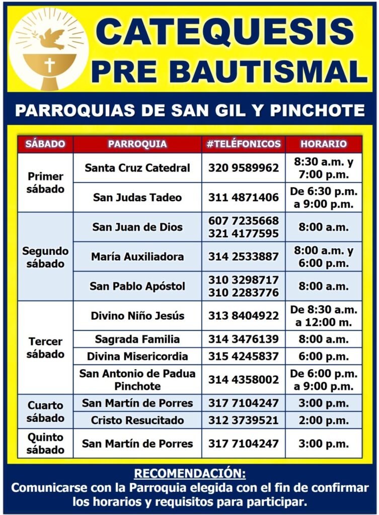 Catequesis Catequesis pre sacramental (Bautismo) en las parroquias de San Gil y Pinchote, agéndate, prepárate, conoce tu fe, vive como Iglesia que se reencuentra con su misión.